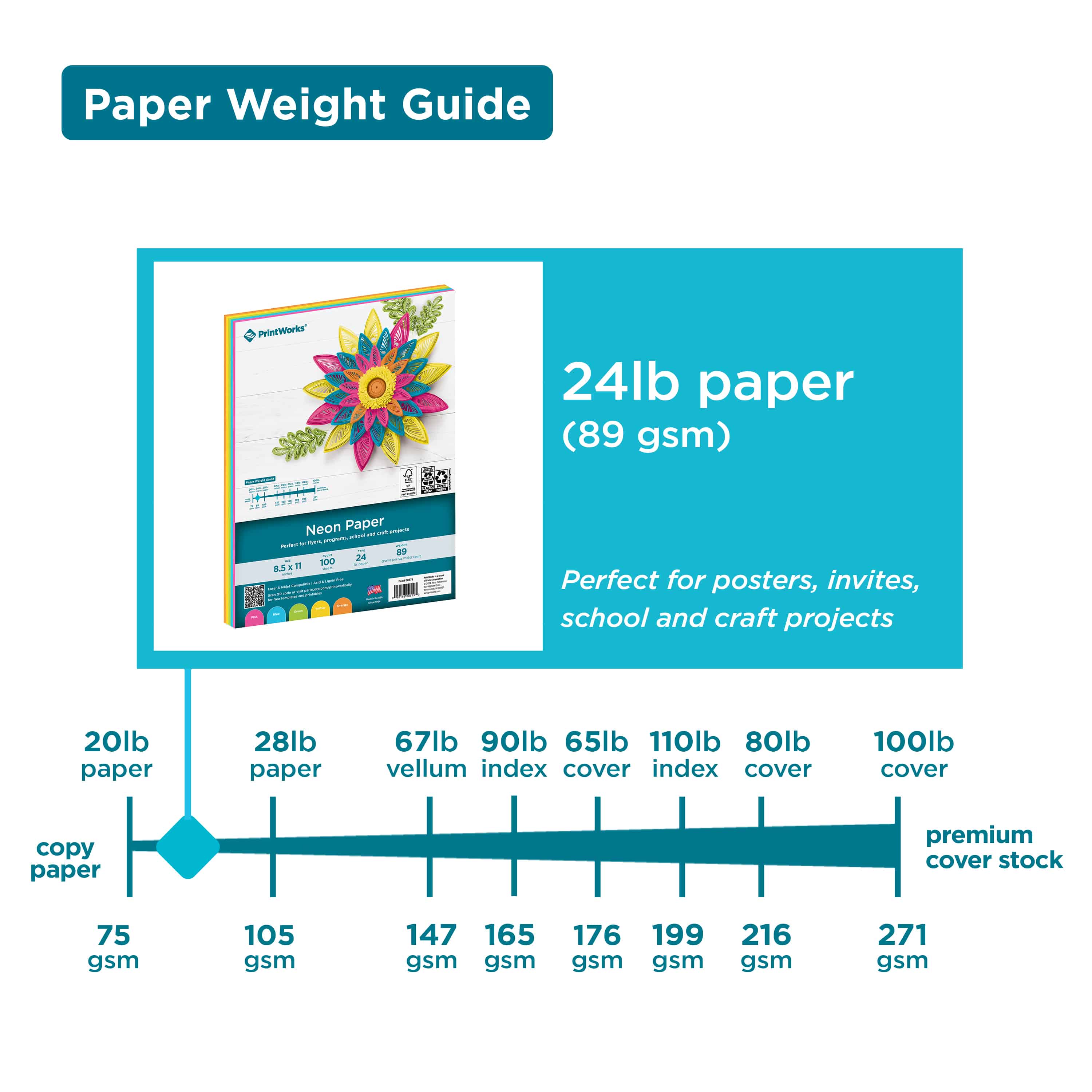 PrintWorks Neon Paper is great for flyers, signs, report covers, school and craft projects that really pop! The five lively colors of yellow, blue, green, pink, and orange make it ideal for crafting vibrant works of art. PrintWorks Neon Paper 24 lb. (89 gsm) is slightly heavier than standard copy paper yet lightweight enough for origami, flyers, posters, folded projects, paper quilling and more! PrintWorks Neon Paper is guaranteed to give you impactful results on all printers and copiers. Acid and lignin free for archival quality prints. You can print responsibly knowing that this paper is made with FSC-certified wood fibers from responsibly managed North American forests. Whether for use at home, office or the classroom, PrintWorks Neon Paper is perfect for all your craft project needs.