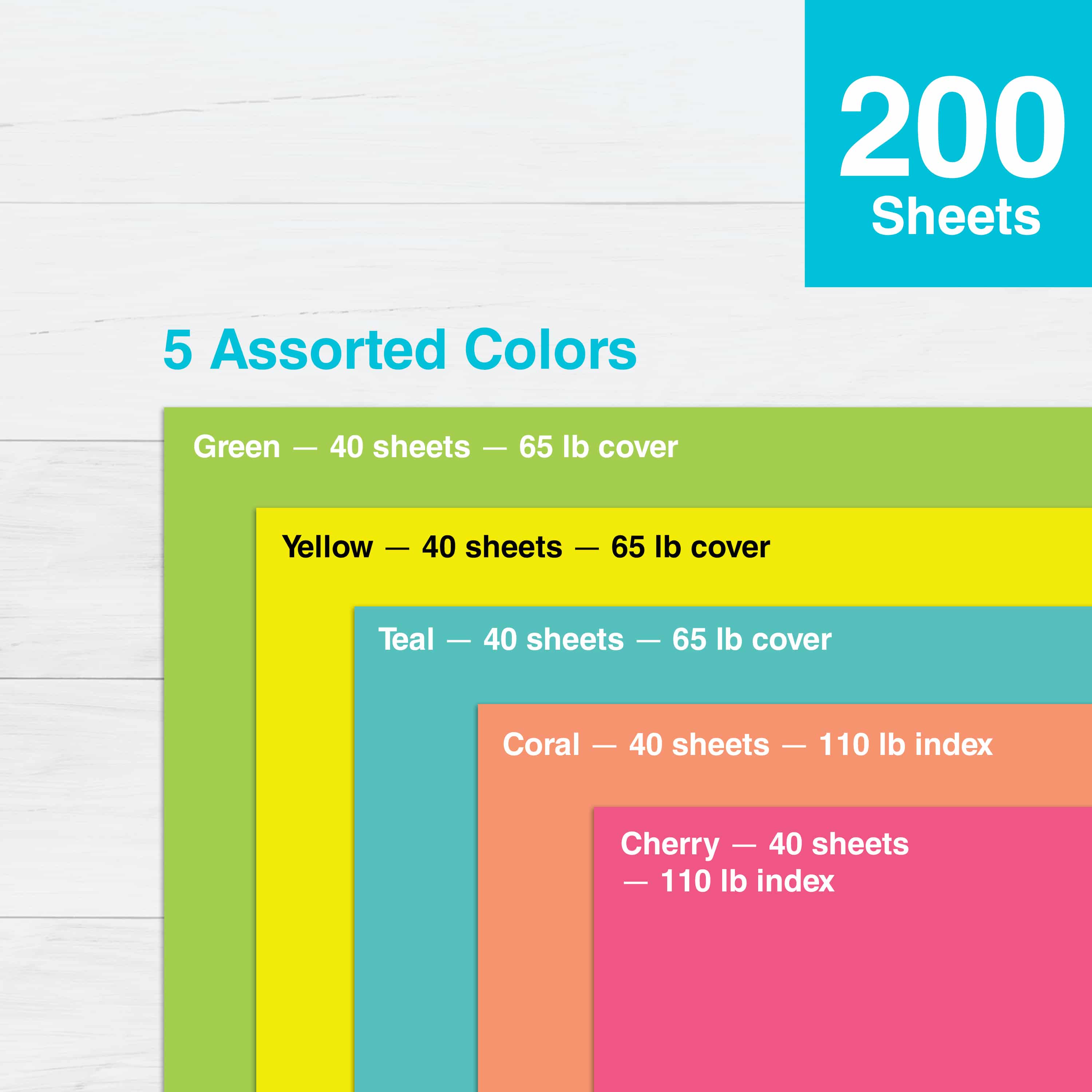 - Each pack of 8.5″ x 11″ colored cardstock includes these five bright colors: cherry, coral, green, yellow, and teal