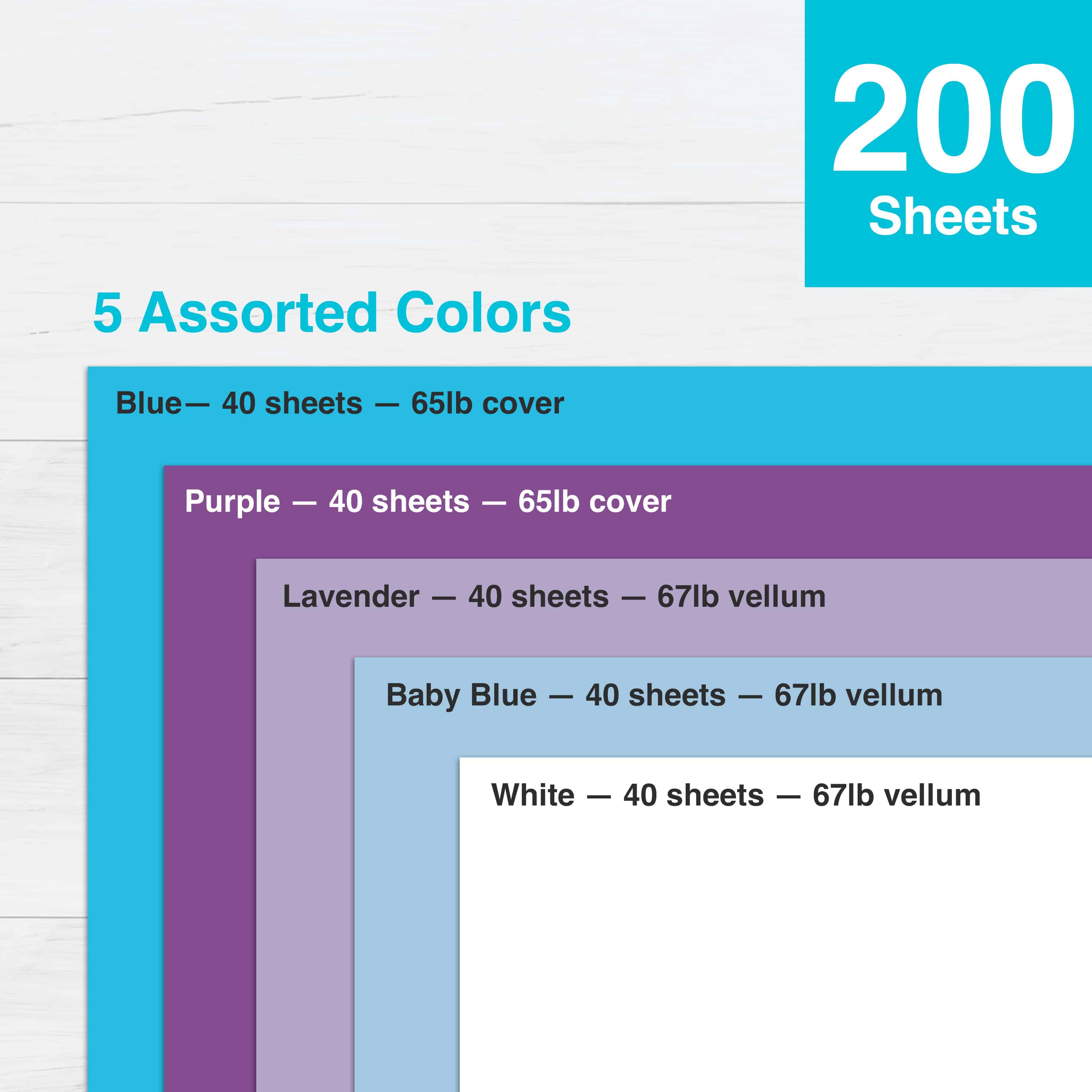 - Each pack of 8.5″ x 11″ colored cardstock includes these five bright colors: baby blue, purple, blue, lavender, white
